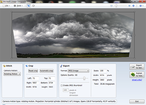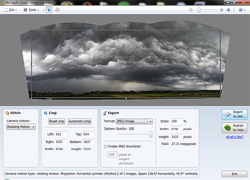 発達した巨大な積乱雲、スーパーセル。写真に撮ろうと思うと広角でも収まり切らないことが多く、苦労する被写体のひとつです。そんな時、フリーのパノラマ合成ソフトが重宝します。ワタシが使用しているのはマイクロソフト製のImage Composite Editor(以下ICE)です。フリーのパノラマ合成ソフトをいくつか使いましたが、コレが一番だと思います。なにより繋ぎ目が綺麗ですし、TIFFファイルが読み込めるのも高評価につながっています。