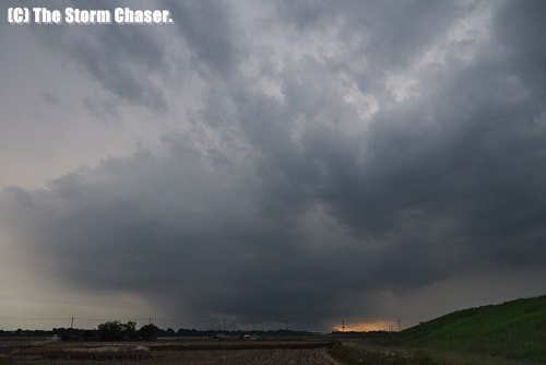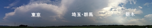 写真は茨城県南西部より撮影したパノラマです。画面左、東京方面に見えたかなとこ雲の大きさが際立っており、雷雨が広範囲に広がっていることがわかります。真ん中は秩父方面から流れてきた積乱雲のかなとこ部分です。画面右にあるのは栃木県南部から流れてきた積乱雲です。