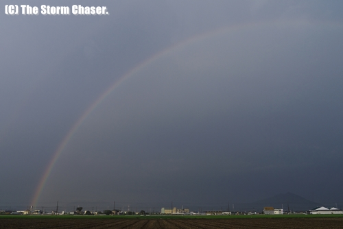 2013年7月8日、関東地方では各地で猛暑になり、前日に引き続き大気の状態が不安定になりました。北関東では昼頃から小さな雷雲がいくつも発生、夕方になると東京・埼玉方面で雷雲が発達しました。各地で大雨洪水警報や竜巻注意情報が発表され、東京と埼玉で落雷による事故が発生しています。茨城県南西部では東を除く三方向を雷雲に囲まれ、一時激しい雷雨になりました。ただ、雨は長く続かず、約1時間後には雲の切れ間に夕日が出て、東の空には虹が現れました。
