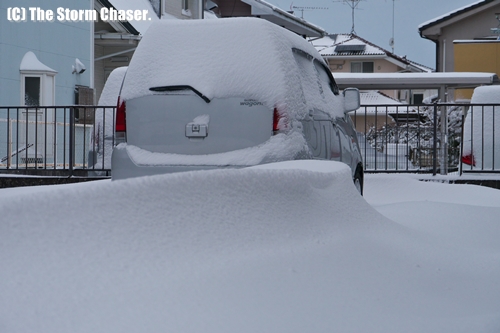 2月9日朝、吹き溜まりではタイヤが埋まるほどの積雪。© Yutaka Aoki. All rights reserved.