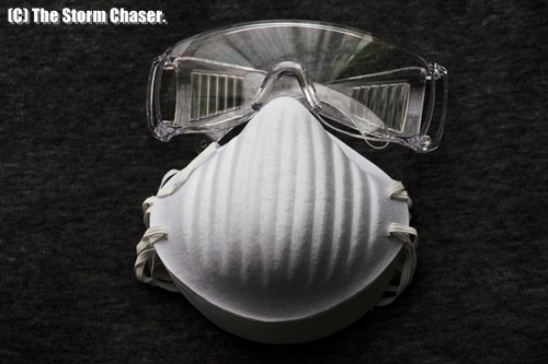 当然、そのような状況では撮影者も埃の影響を受けます。撮影中は全身埃まみれになりますが、特に気を付けたいのが、目、鼻、口です。目を守るゴーグルと、埃を吸い込まないための防塵マスクは必需品です。最近では100円ショップでもこのような品物を扱っているため、懐にも優しく助かっています。ワタシが使用しているのは大手100円ショップで売られている、眼鏡の上から装着できるポリカーボネイト製のゴーグルと、10枚入りのお得用防塵マスク(簡易なもの)です。