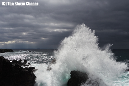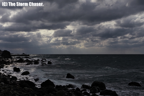 越前海岸(福井県)は日本海側気候で、日本海を渡って入ってくる北西からの冷たい季節風と対馬暖流の温度差により水蒸気が発生、山脈に衝突することで雨雲・雪雲が発生し、降水・降雪をもたらします。雪が舞う鉛色の空、湿った冷たい海風、弾ける波飛沫、見た目にも荒々しく身を切るような寒さです。乾燥した晴天が続く関東の冬とは対照的な光景ですね。