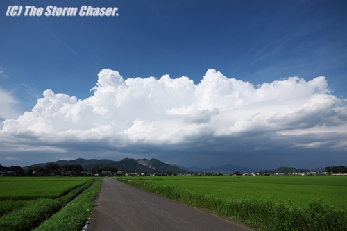 2015年7月19日、午前11時に関東甲信地方の梅雨明けが発表されました。梅雨明け10日の猛暑がスタートを切り、午後になると早速雄大雲がモコモコと成長をはじめ、アッと言う間に積乱雲になりました。雄大雲と積乱雲の違いは雷の有無と雲頂のほつれ(毛状)があるか否かの2点です(気象観測の手引きより)。まずは茨城県桜川市にある富谷山のあたりで雄大雲をキャッチ、そのまま栃木県茂木町に進み、雨のエリアを通り越した先の茨城県笠間市周辺で雲を追い越しました。雷鳴も数回聞こえ、そのまま東進して水戸方面へ流れて行きました。強度的には雨も雷も大したことなく、涼をもたらす夕立という表現がピッタリの雨でした。