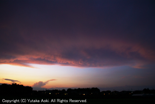 何となくあきらめ切れず、日没後にもう一度撮影に出ました。こちらの熱意が空に伝わったのか、低く垂れ込める雲底が赤く染まるシーンを撮影できました。何となくSFチックで、不気味な空模様です。雷雨終息後も大気の不安定な状態が続いていました。