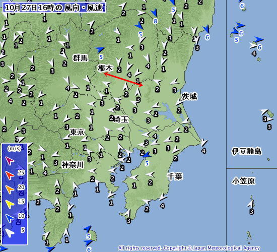 出典…気象庁ホームページ・10月27日16時の風向き・風速。栃木県南部で収束している。