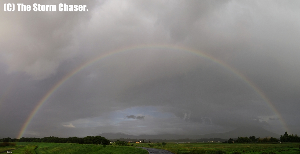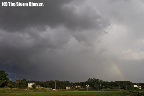 © Yutaka Aoki. All rights reserved.雨雲は小さなもので、強い南風とともに10分~20分程で通り過ぎていきます。そして、雨が残る間に日がさしてくると虹が出る確率が高くなります。今更説明の必要もありませんが、虹は太陽光が雨粒により屈折することで起こる大気光学現象です。