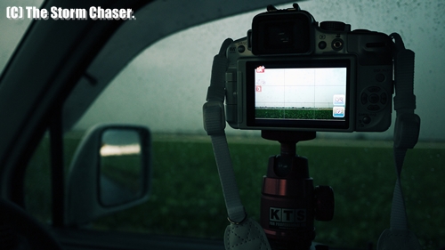 自動車内に三脚を立て、雷を撮影している様子。
