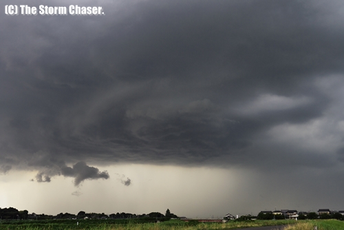 写真はメソサイクロンが可視化した姿です。ウォールクラウド(壁雲)が地上に向かって垂れ下がりながら、反時計回りに回転している状態です。2012年7月17日、広い範囲で梅雨明けした日、北関東では午後から大荒れになりました。竜巻注意情報も発表され、撮影地から30km離れた栃木県栃木市では、ダウンバースト(F0)の発生により怪我人も出ています。竜巻の発生が多発した今年を象徴する1枚として、メソサイクロンを選んでみました。