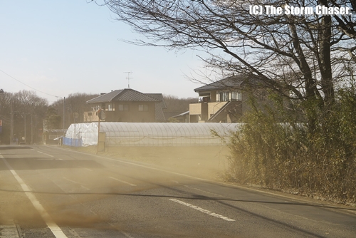 北関東でも乾いた強風が吹き、茨城県筑西市では14時20分に最大瞬間風速21.4m/sの非常に強い風を観測しています。風速15m/sを超えると、風に向かって歩く時に前傾姿勢をとらないとバランスを崩して転倒することがあります。田畑の広がる地域では、強い風に巻き上げられた土埃で視程を遮られる風塵が発生しています。ある意味、風塵や塵旋風はこの時期の風物詩、冬から春になる頃に良く見られる現象です。これから三寒四温を経て、春がやってくるのでしょう。