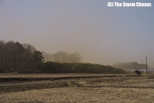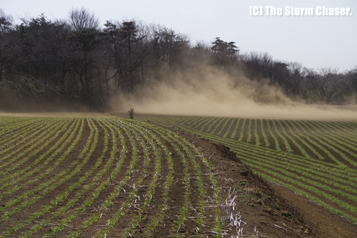 2013年3月2日、関東では前日に2年振りの春一番が吹いて気温が上がりましたが、一転して今日は冬型の気圧配置が強まり、西寄りの冷たい風が吹き荒れました。茨城県筑西市では15時に最大瞬間風速22.4m/sを観測しています。前夜に雨が降ったものの、昼近くなると地面が乾き、田園地帯では風塵が発生しました。風塵とともに塵旋風もあちこちで発生し、巻き上げられた土煙で数10m先も見えないような状況でした。風塵は春塵(しゅんじん)とも呼ばれ、春の季語になっています。春の風物詩とはいえ、少々厄介な現象です。