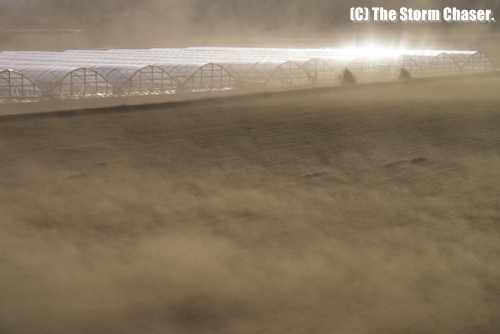 撮影中はゴーグル、防塵マスク、ニットキャップで防御、それでも鼻や耳にまで埃が侵入してきます。体質により、呼吸器などの健康に影響することもあるので、要注意です。風塵の厄介なところは、家の中にも入ってくることです。我が家でも北側の窓枠周辺は土埃でザクザクです。駐車中の車も同様です。厄介な風塵ですが、被写体として見ると迫力があるので、悩ましい現象と言えるかもしれません。撮影機材の故障の原因にもなるため、撮影後のメンテナンスは念入りに行います。