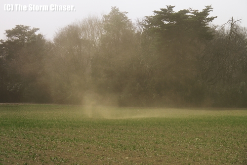 風塵と並ぶ春の風物詩、塵旋風(じんせんぷう)です。別称はつむじ風、英語ではDust Devil(ダストデビル)と呼ばれます。塵旋風は地表付近で発生する上昇気流の渦で、強い水平風が加わると上空数10mまで立ち上がることがあります。小規模のものは日常生活の中でも良く見かけ、塵や埃、落ち葉などを巻き上げることで可視化します。突風の一種として分類されていますが、強度的にはF0以下で、大きな被害を出すことは稀です。