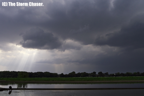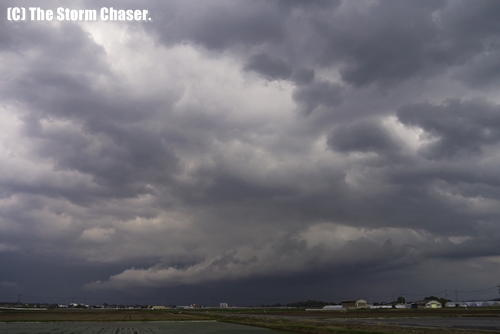 今日の追跡は約5時間と長丁場になりました。12時前に茨城県下妻市付近から撮影開始、北西方向に積乱雲の姿を確認しました。周りの積雲を吸収しながら巨大化してきたところで栃木県真岡市付近まで北上、北西方向が見渡せる農道に車を止めると、間髪入れずに防災無線から竜巻注意情報発表のアナウンスがありました。一気に緊張感が高まり、すぐに逃げ込めるように車の近くで撮影しました。撮影中に一番大事なことは、安全の確保です。