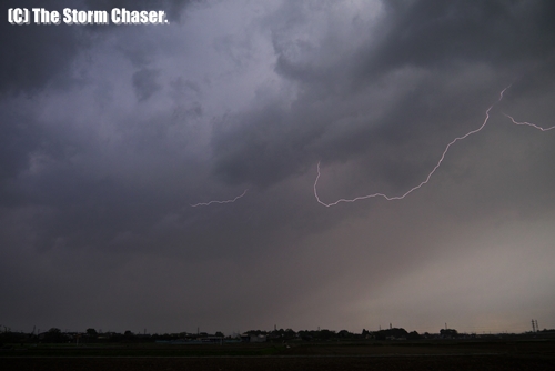 その後少々南下して、茨城県筑西市付近で撮影を続けました。雷鳴が聞こえたため、車の中から雷を撮影します。程なくして大粒の雨が落ちてきたため一時中断、雨雲を避けるように再び南下しました。移動中、筑波山の山頂に変わった形の雲が見えました。つるし雲かと思い車を止めて確認すると、積乱雲の雲底から地上に向かって伸びてくるウォールクラウド(壁雲)であることを確認、反時計回りの回転も見られました。10分程度で形が崩れてしまったため、気付くのが遅かったら撮影できないところでした。