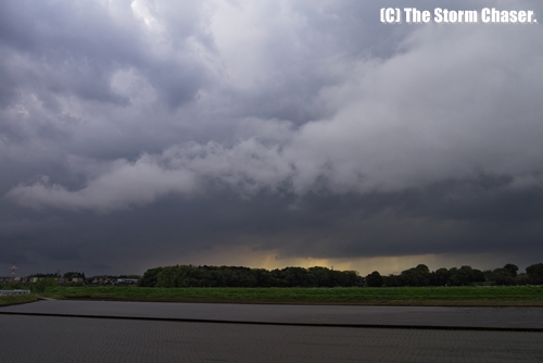 昨日(2013年4月26日)の追跡レポート続編です。栃木県真岡市付近でガストフロントの通過を撮影した後、車で茨城県筑西市方面に南下しながら雲を追い、ガストフロントの真下に突入してみました。1枚目の写真、地上に垂れ下がる黒い雲がアーチ雲の先端部分、その上に見えるのが積乱雲の雲底です。パッと見は漏斗雲にも見えますが、これはテイルクラウドと呼ばれるアーチ雲から地上に向かって垂れ下がる雲です。先端部分では断片雲が不規則に上下動を繰り返しており、複雑な気流が発生していることがわかりました。