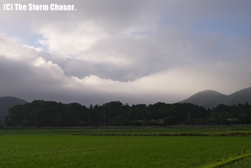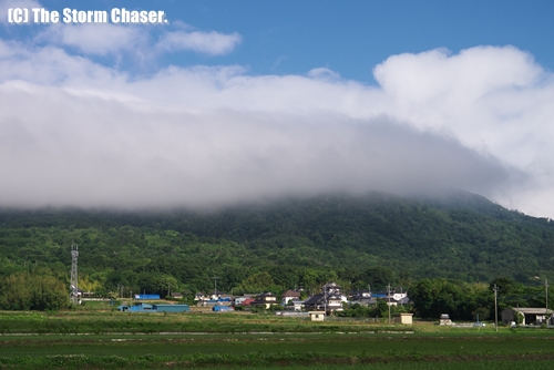 2013年6月12日、台風3号の影響で東寄りの湿った風が吹き、雨引山にモーニンググローリーのような層雲が現れました。雨引山(あまびきさん)は茨城県中西部の桜川市にあり、八溝山地の南端に位置する409.3mの山です。八溝山地南端の筑波連山は1000m以下の山が南北に連なっており、東寄り(太平洋から)の湿った風が入ると、山の東側に雲のダムができ、ダムが一杯になると山頂を越えて西側の斜面に流れてきます。いわば東から流れてくる低層雲をブロックする堤防のようなものです。そのため、山の東側では雨、西側では晴れ、そんなシーンが度々見られます。
