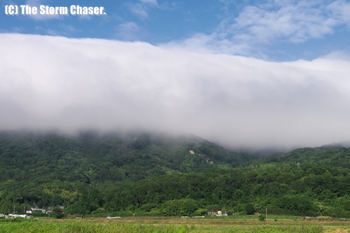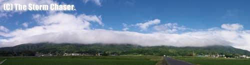 山沿いで見られる横長の層雲は、山かつら、大蛇雲(おろちぐも)とも呼ばれています。どちらかと言えば降雨時に見られることが多いため、青空バックはレアだと思います。実際、撮影時も直前まで雨が降っており、急速に回復して青空が見えたと思ったら、数時間後には再び雨が降りだしました。ちなみに、モーニンググローリーはロール状の層積雲で、写真の層雲とは別物です。