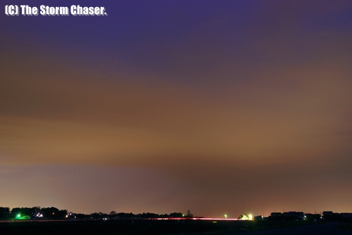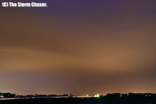 その後少々南下して、茨城県筑西市付近で撮影を続けました。雷鳴が聞こえたため、車の中から雷を撮影します。程なくして大粒の雨が落ちてきたため一時中断、雨雲を避けるように再び南下しました。移動中、筑波山の山頂に変わった形の雲が見えました。つるし雲かと思い車を止めて確認すると、積乱雲の雲底から地上に向かって伸びてくるウォールクラウド(壁雲)であることを確認、反時計回りの回転も見られました。10分程度で形が崩れてしまったため、気付くのが遅かったら撮影できないところでした。