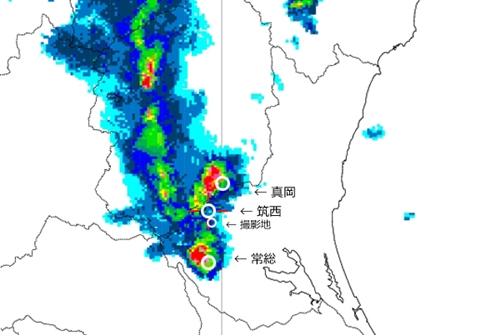 当日、筑西市玉戸周辺で撮影しており、Exifを見ると12:27分まで屋外で撮影していました。筑西市玉戸周辺より、北西方向(玉戸駅、伊佐美方面)に向かってカメラを向けていました。12:27分の時点で激しい雷雨になり、家に戻り室内での撮影に切り替えています。