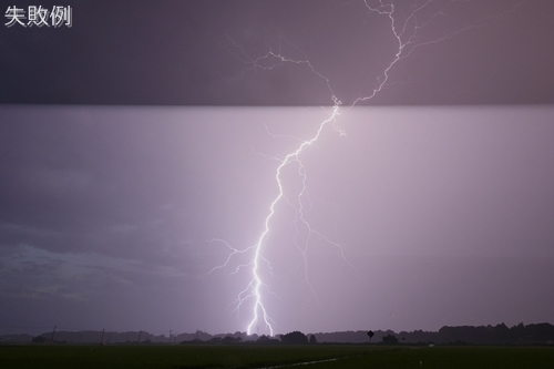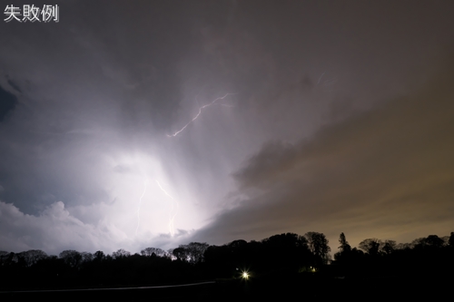 ■失敗例2、高感度のバルブ撮影では露出オーバーしてしまい、稲妻の周辺が明るくなりすぎてディティールが消失しています。これでは写真としてNGです。バルブ撮影をする時は最低感度で撮影しましょう(機能拡張で低感度を使用するとダイナミックレンジが狭くなります)。