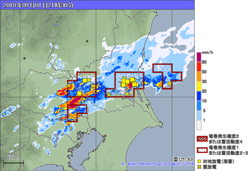 2018年9月10日、秋雨前線の通過に伴い埼玉県、茨城県、栃木県で積乱雲が発達、ガストフロントが複数発生しました。1つ目は14時過ぎに栃木県南部の真岡市で発生、2つ目は16時過ぎに茨城県西部の筑西市で発生、幸い2つとも突風被害は無かったようです。9月は突風被害が多い月です。今年は秋雨前線の活動が活発ですので、怪しい雲を見かけたら迷わず屋内に避難しましょう。