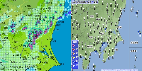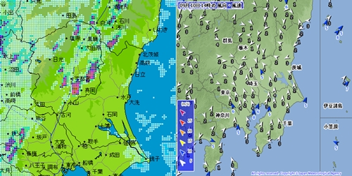 14時過ぎの強雨域と風の様子。出典…東京電力・雨量・雷観測情報、気象庁ホームページ。