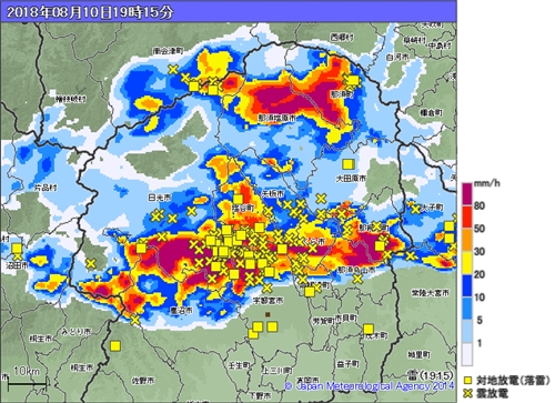 *出典・気象庁ホームページ…8月10日19時15分頃の雨と落雷の様子。