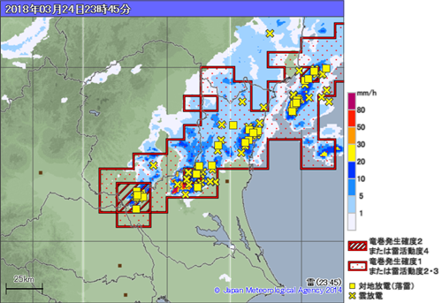 撮影当日、3月24日・23時45分頃の落雷と雨の状況(出典…気象庁ホームページ)。
