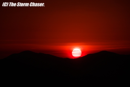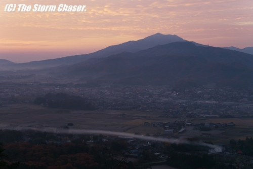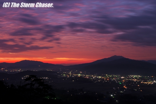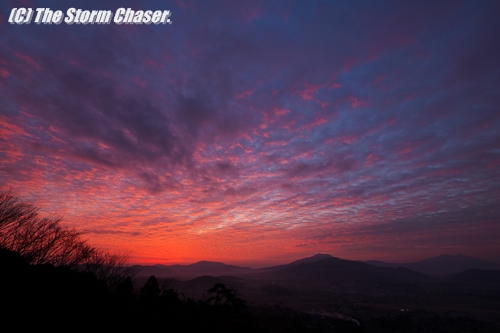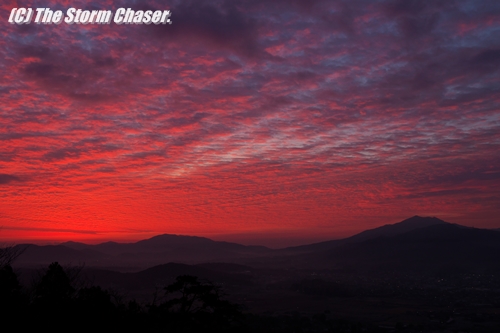2015年12月10日、西から低気圧が接近しているため、朝焼けを狙って茨城県桜川市にある富谷山の中腹に行ってみました。東の空が少しづつ明るくなり山の稜線がハッキリしてくると、朝焼けに染まり燃えるような高積雲が見られました。「夕焼けは晴れ、朝焼けは雨」そんなことわざがあるように、朝焼けは天気が崩れる合図です。よく知られている観天望気のひとつですね。
