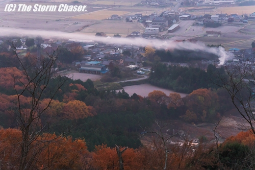 撮影中、ふと眼下を見ると煙が真横にのびていました。逆転層に閉じ込められて行き場を失った煙が、真横にのびている様子です。通常、高度が上がるほど温度が低くなりますが、放射冷却で地表の温度が低くなると、上空の温度のほうが高くなることがあります。冷たい空気が暖かい空気で蓋をされている状態、これが逆転層です(気温の逆転現象)。逆転層が地表に接している場合は接地逆転層と呼び、野焼きの煙などが上昇できずに横にのびていきます。冬の朝の風物詩です。